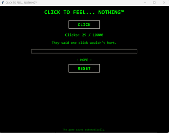 | Tags | anti-fun, Clicker, existential, Minimalist, Short, solo-developer |